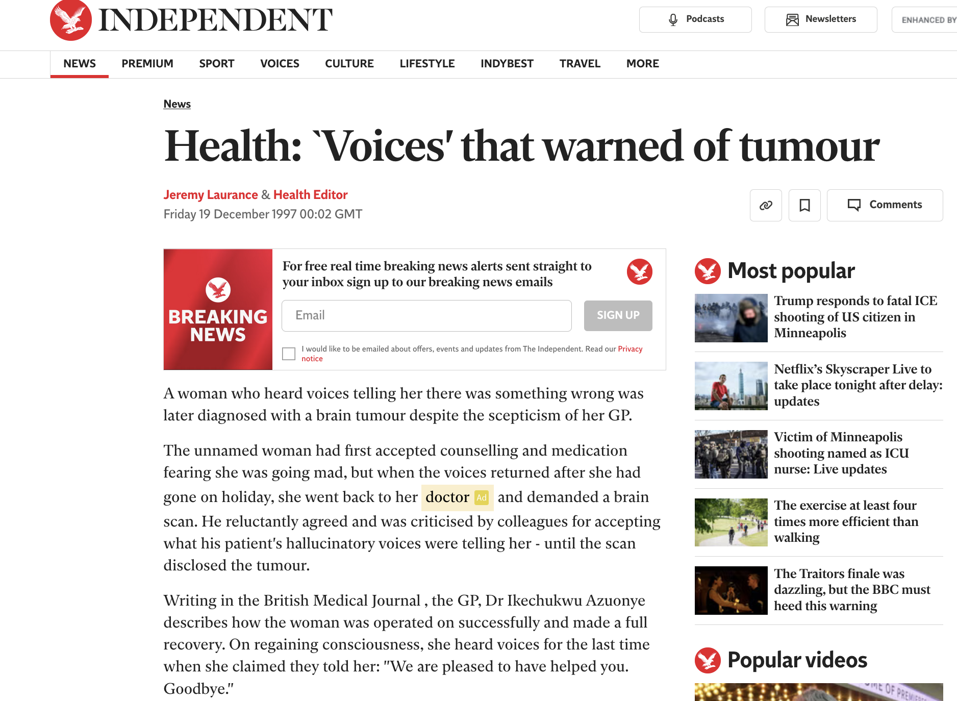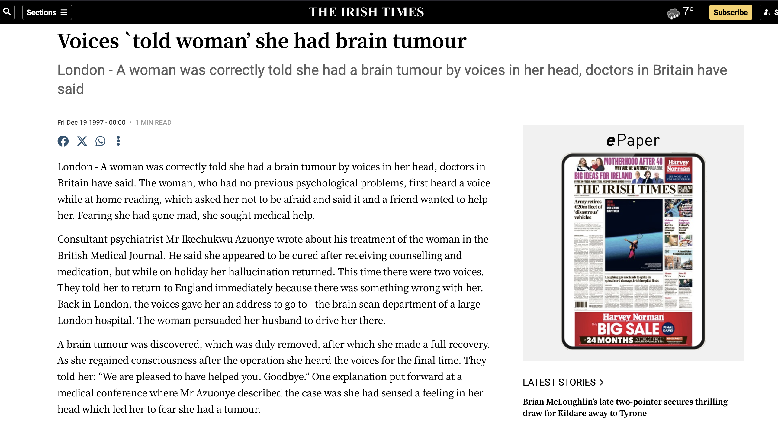 Orta yaşlı bir kadın beyninde bir tümör olduğunu söyleyen sesler (varsanılar?) duyuyor. Önce kendisi ve doktorlar tarafından ciddiye alınmayan bu sesler ısrar edince, hatta hastaya nereye gitmesi gerektiğini bile söyleyince, yapılan beyin görüntülemesinde gerçekten seslerin dediği çıkıyor ve beyinde bir tümör bulunuyor. Daha da ötesi, bu tümör ameliyatla çıkarıldıktan sonra sesler kesiliyor, sadece bir kez tekrarlıyor ve onda da “Sana yardım edebildiğim için memnunum. Hoşçakal!” deyip kayboluyor.